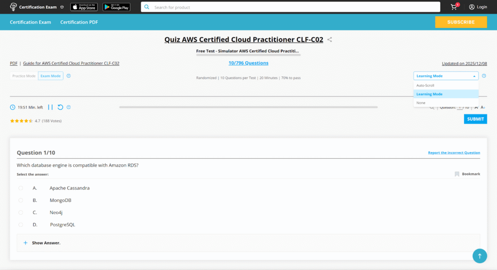 With any AWS Cloud Practitioner practice exam accuracy is key. Outdated or incorrect questions can ruin your study. Sites like Certification Practice say their questions are “expertly crafted” to be just like the real thing. Prepaway says their questions are validated, yet folks say some questions can be arguable among users. When considering wherever to use a resource, consider recent updates and make sure it is entirely in line with the current CLF-C02 exam guide.